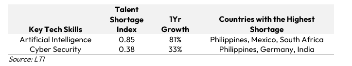 As per our research backed by LinkedIn Talent Insights, job postings seeking out artificial intelligence skills and cybersecurity skills have increased at 81% and 33% respectively in 2024-2025, whilst its talent shortage index has also been quite high, indicating a wider gap.