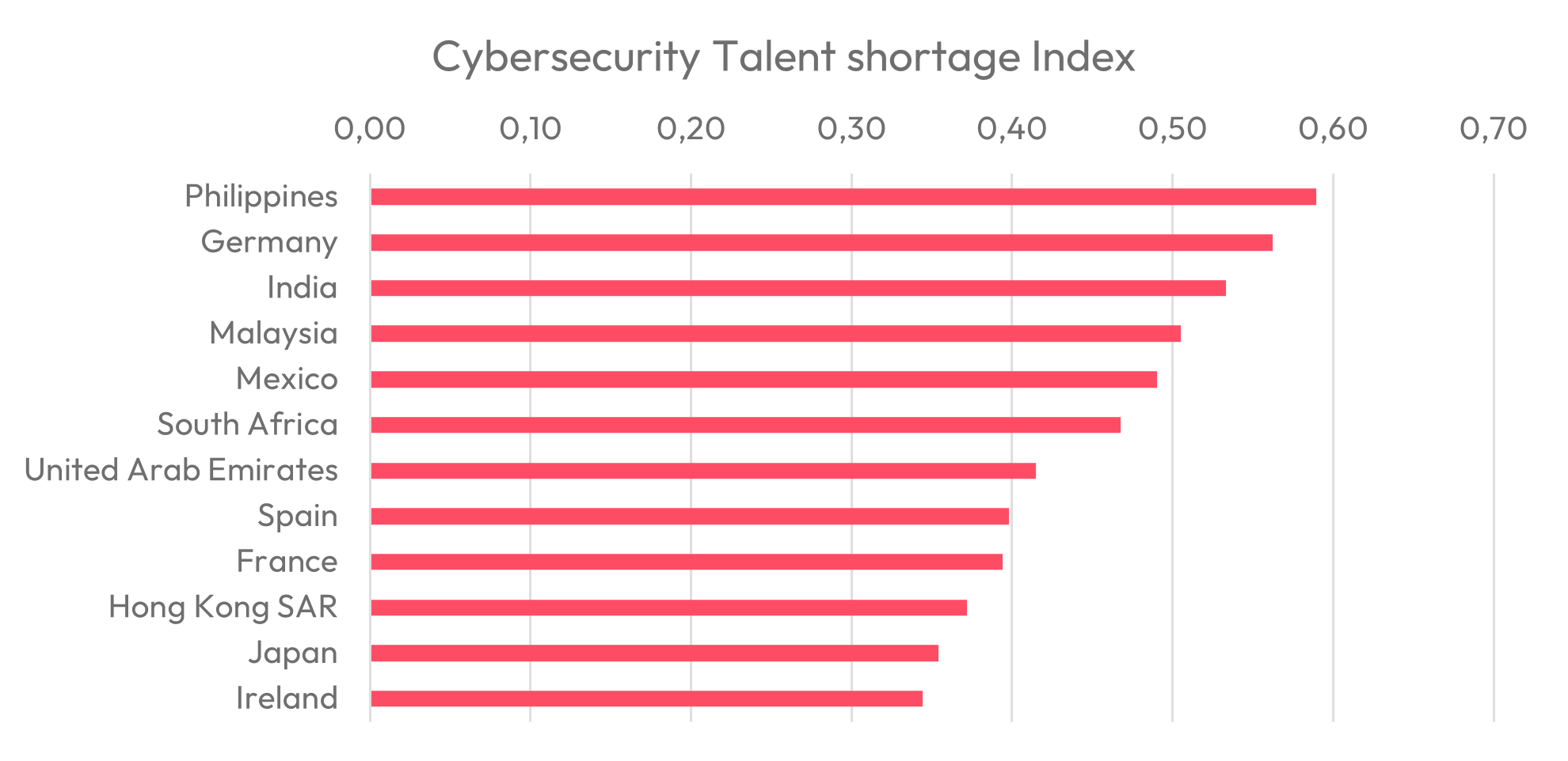Cybersecurity is key to digital resilience, but the demand for cybersecurity experts is higher than the supply worldwide. The talent shortage index reveals that countries like the Philippines, Germany, India, and Indonesia are facing the steepest shortages. This shows a growing need, especially in fast-developing digital economies where cybersecurity is also developing.